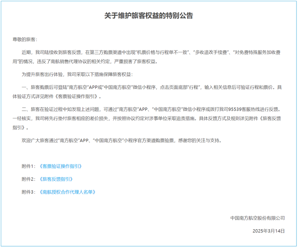 ·第三方购票平台多收手续费?南航回应来了!3月14日,中国南方航空股份有限公司发布《关于维护旅客权益的特别公告》:近期,我司陆续收到旅客反馈,在第三方购票渠道中出现“机票价格与行程单不一致”“多收退改手续费”“对免费特殊服务加收费用”的情况,违反了南航销售代理协议的相关约定,严重损害了旅客权益,航司采取多项措施保障旅客权益。详情↓